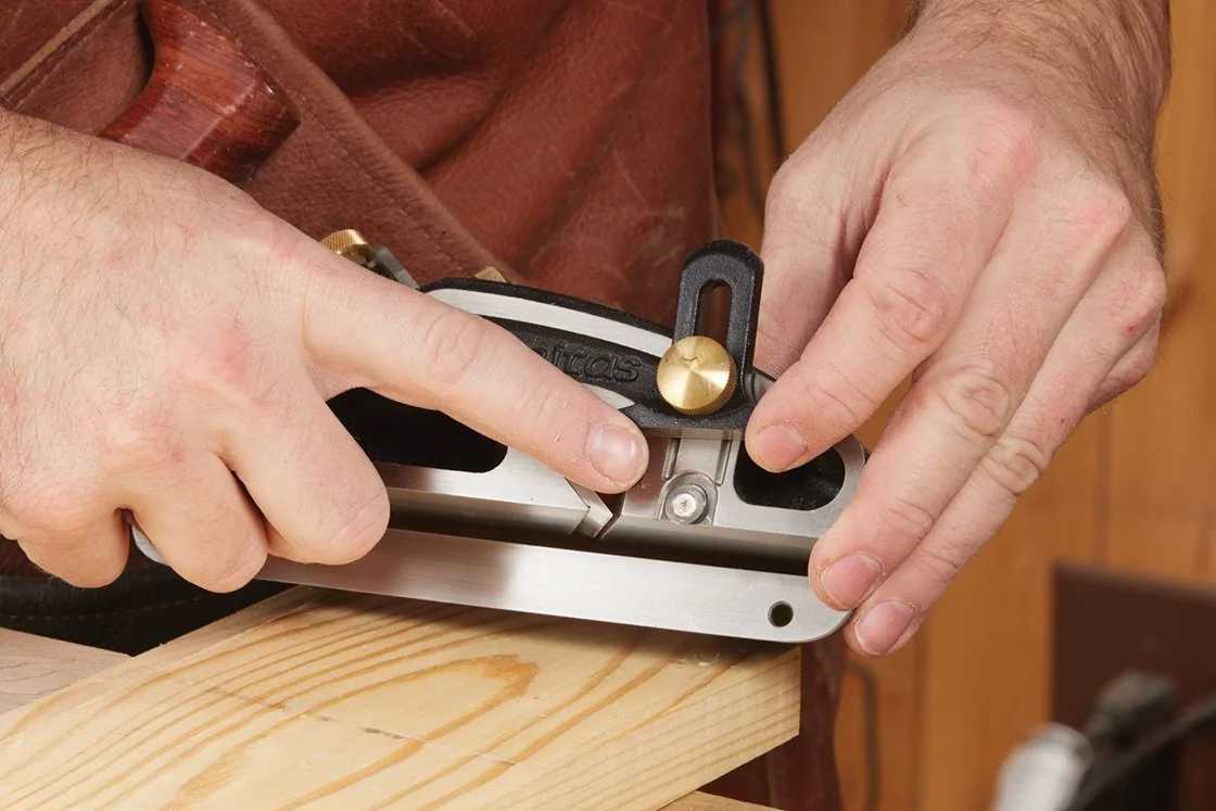 If vintage planes aren’t your style, Veritas offers a modern rabbet plane, as seen in this section (there are others, but this just happens to be the one I have). In use, they’re very similar to their wood counterparts but with some features that make them a bit easier to use. First, they have a modern blade adjuster, so you don’t have to fidget with a plane-adjusting hammer. Next, most metal body planes will have a fence that sets the width of the rabbet (some vintage wood planes also have them—these are referred to as fillister planes). You can see this in photo 8 above. (I removed the front knob off my rabbet plane, as I like to have a lower grip, keeping my fingers against the fence). Now, to set the depth, there’s a depth stop. In photo 9, you can see that it is engaged, keeping the plane from cutting any deeper.